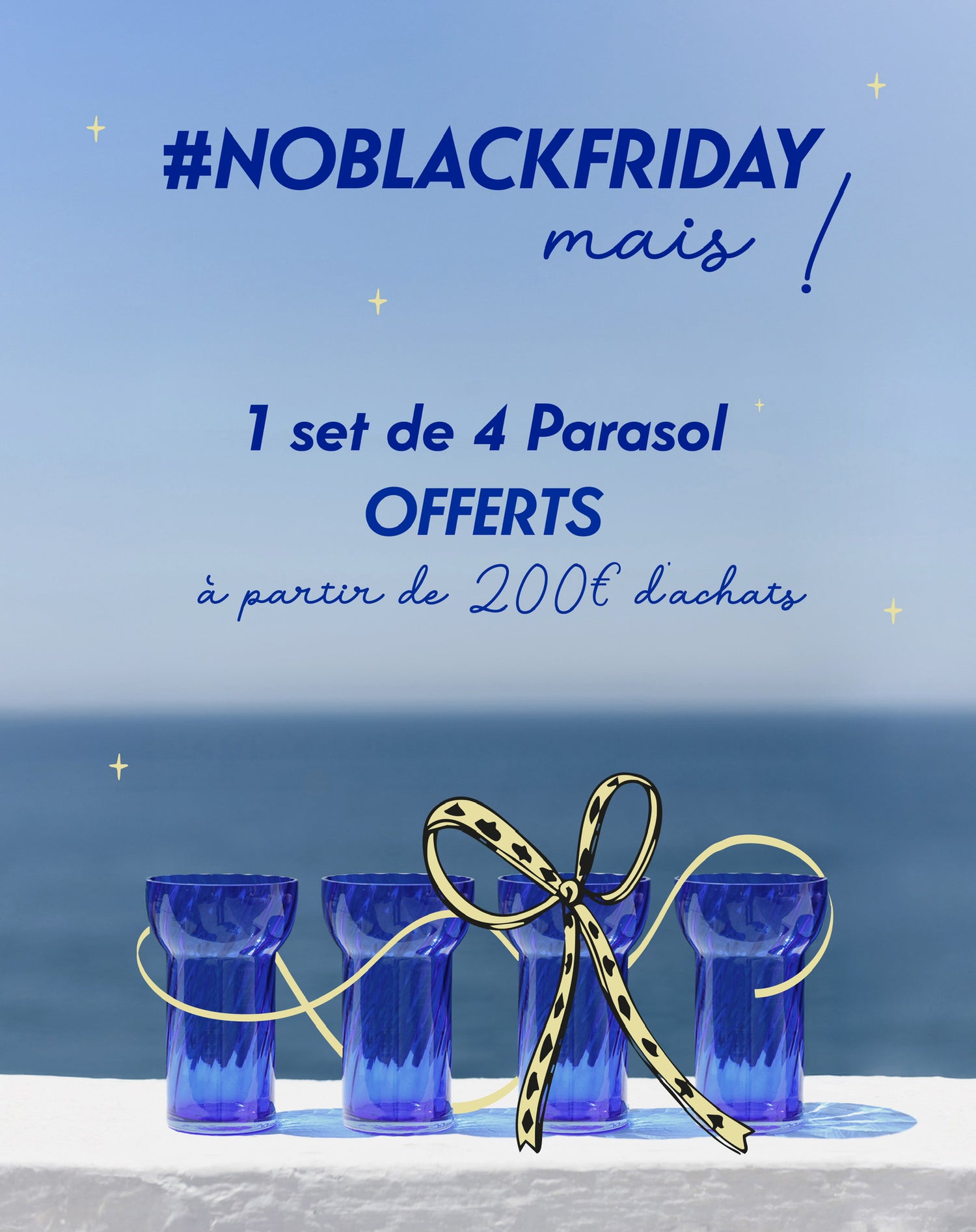 Nos prix sont les mêmes toute l'année, vous le savez ils sont calculés au plus juste. Mais nous avons décidé de vous gâter : 4 verres Parasol Bleu Azuré Grand Modèle offerts pour 200€ d'achats jusqu'au 2 décembre 23h59 ! Les verres s'ajouteront automatiquement à votre panier....