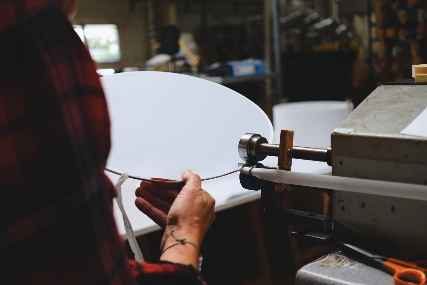 Ce travail de gainage demande une dextérité particulière pour garantir que le tissu épouse parfaitement la forme tout en diffusant une lumière douce et homogène. Le diffuseur interne, en plastique translucide lui aussi recouvert de tissu, permet de contrôler la lumière pour créer une ambiance chaleureuse et accueillante.
