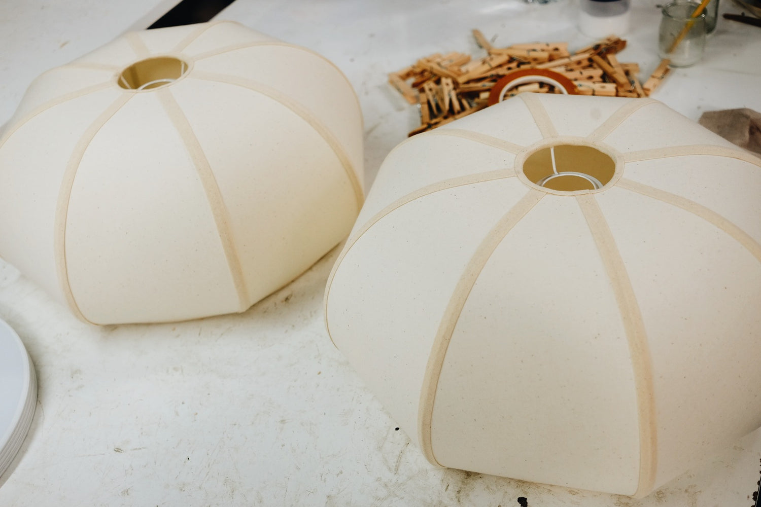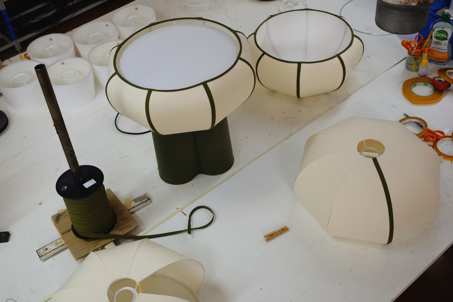 La fabrication commence par le façonnage de la structure en fil d’acier, qui sert de base à l’abat-jour. Cette armature délicate est conçue avec une grande précision pour assurer solidité et légèreté. Ensuite, Les artisans recouvrent cette structure d’un tissu en coton moucheté ou en lin naturel teinté, selon le modèle choisi.
