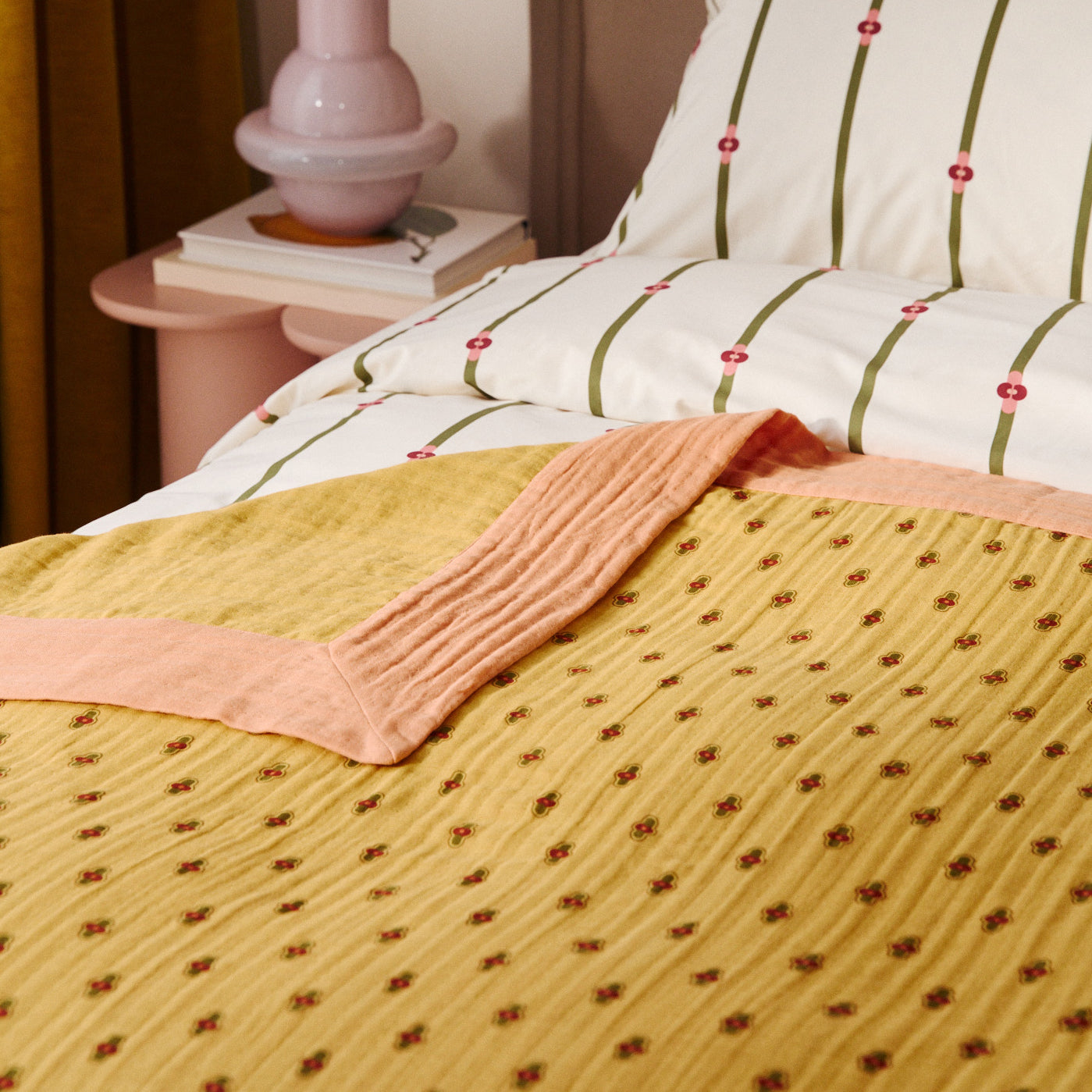 Tissé en 4 épaisseurs pour une sensation de confort ultime Gaze de coton imprimée Jaune Immortelles et bordure Rose Fard
