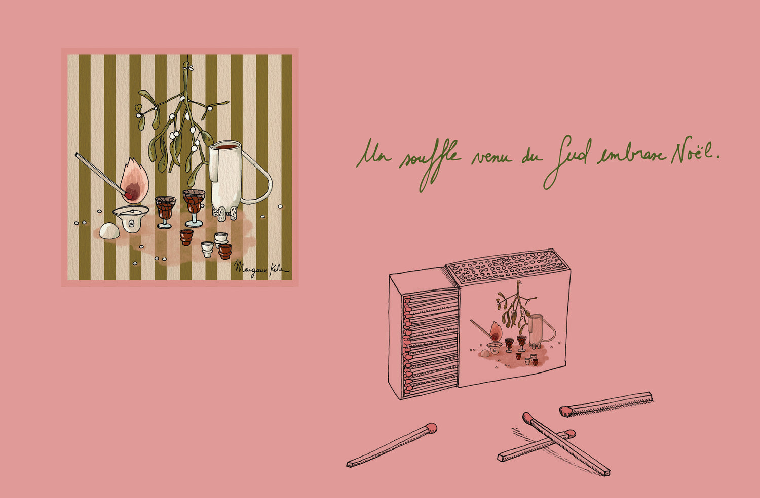 Pensée comme un petit objet du quotidien à la poésie inattendue, Feù — “flamme” en provençal — accompagne la collection de Noël Rose Fard. Ces allumettes aux têtes roses se glissent dans un écrin illustré à la main par Margaux Keller, orné de rayures Rose Fard et Vert Romarin. Comme une parenthèse ensoleillée au cœur de l'hiver, cette boîte célèbre l'art de la flamme : allumer une bougie, un feu, un instant de chaleur et de lumière.